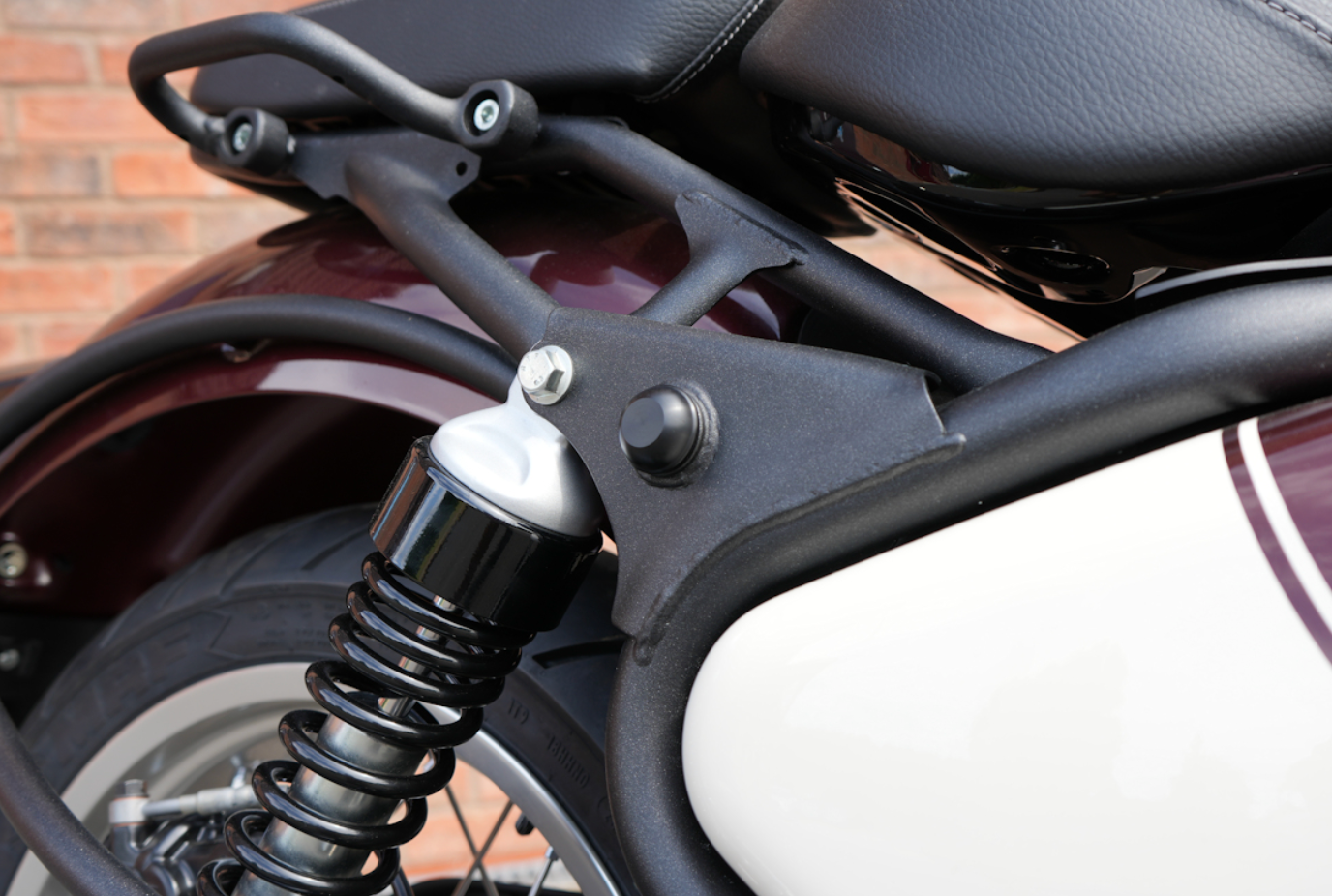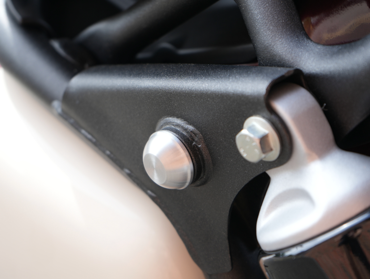 Jeu de bouchons en aluminium noir conçu pour masquer proprement les orifices ouverts situés à l’avant des amortisseurs arrière sur les modèles Royal Enfield 650 Classic et 650 Shotgun.