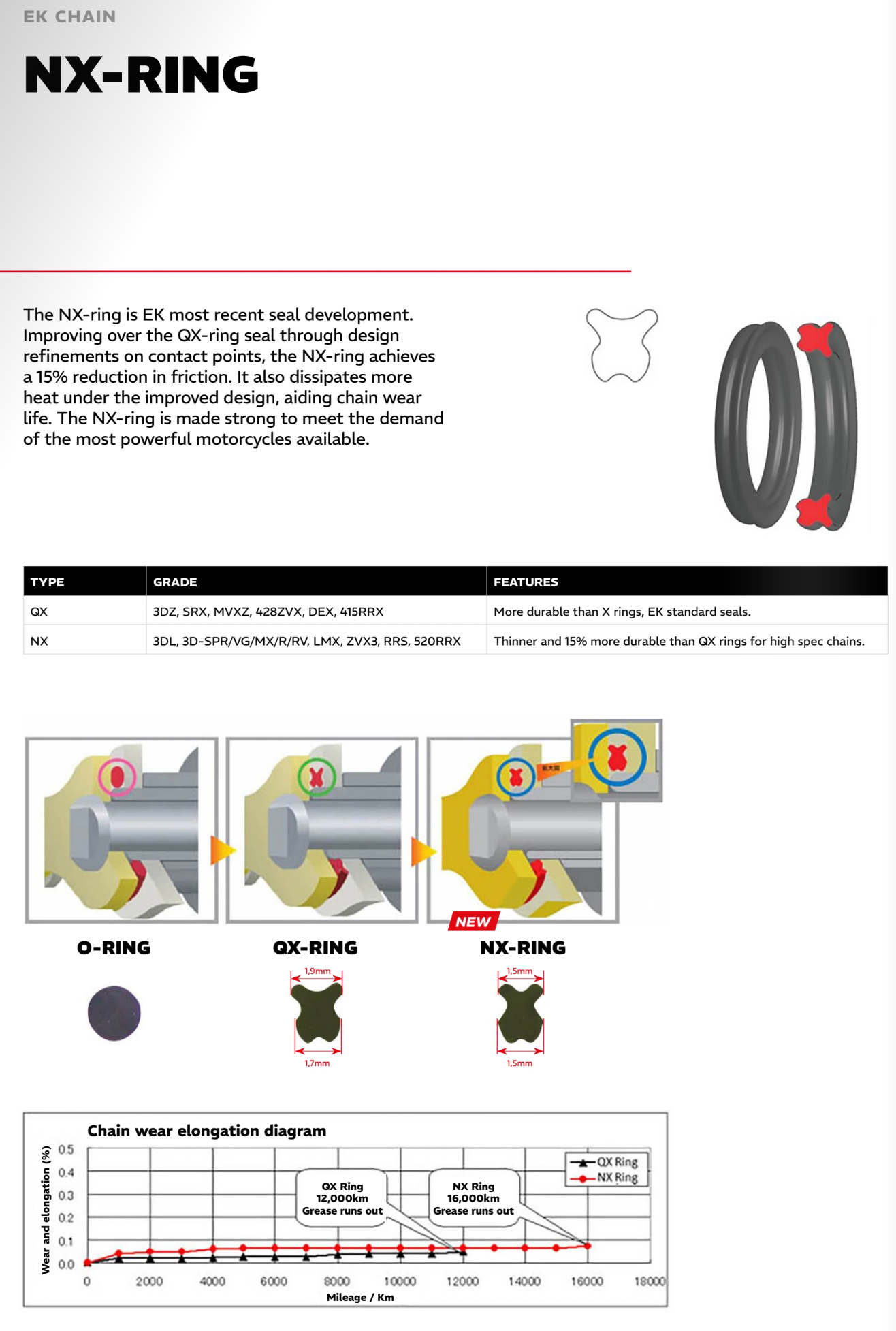La technologie NX-Ring améliore la rétention de lubrification interne, réduit les frottements et garantit un fonctionnement fluide et silencieux, tout en augmentant significativement la durée de vie de la chaîne.